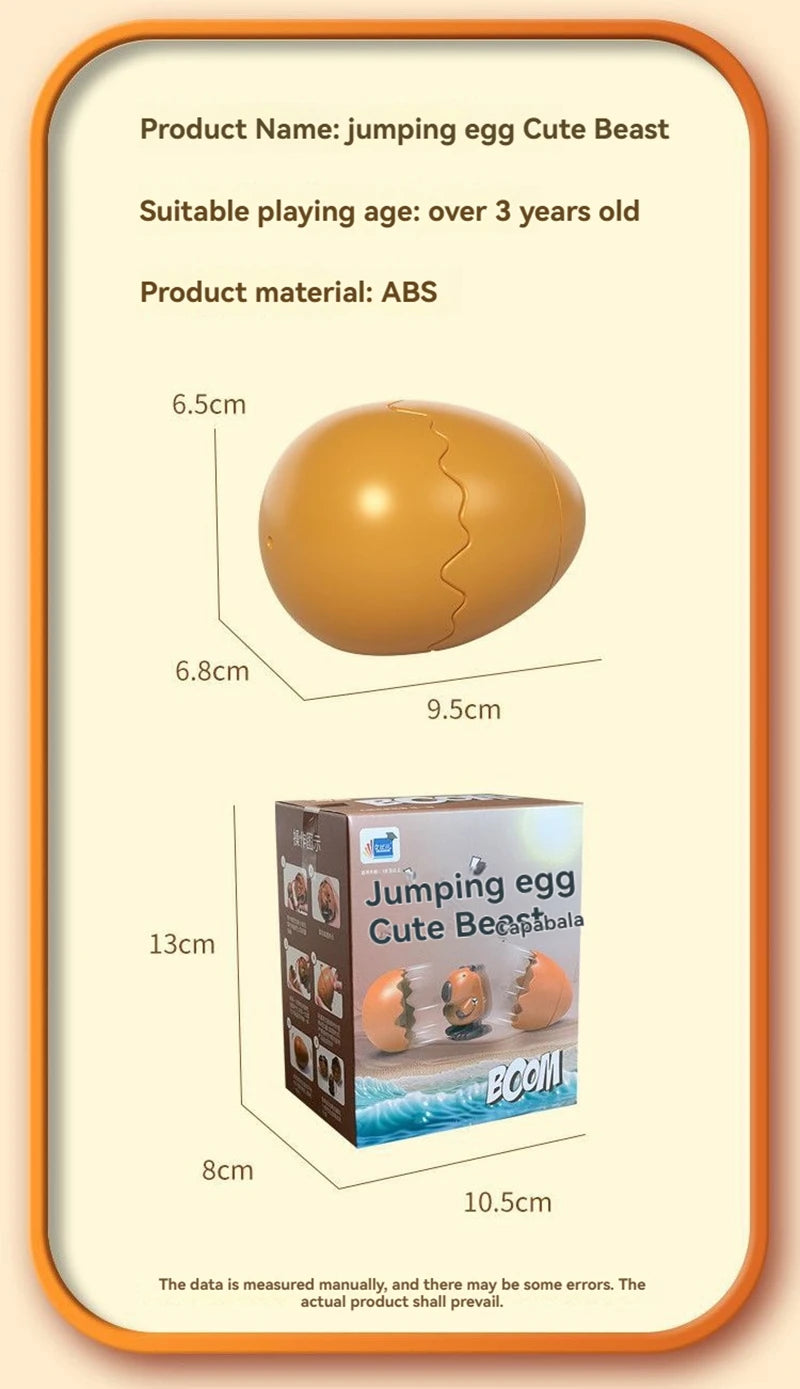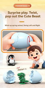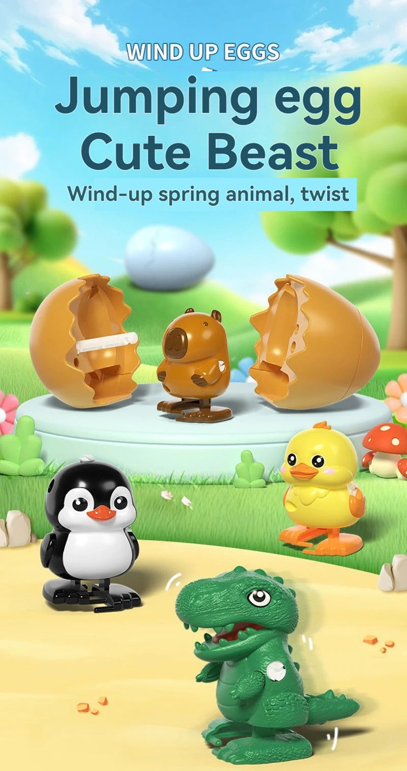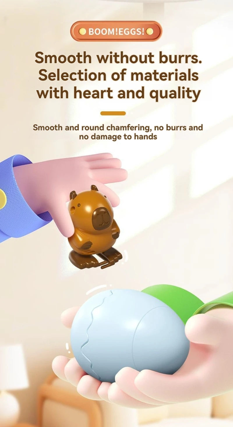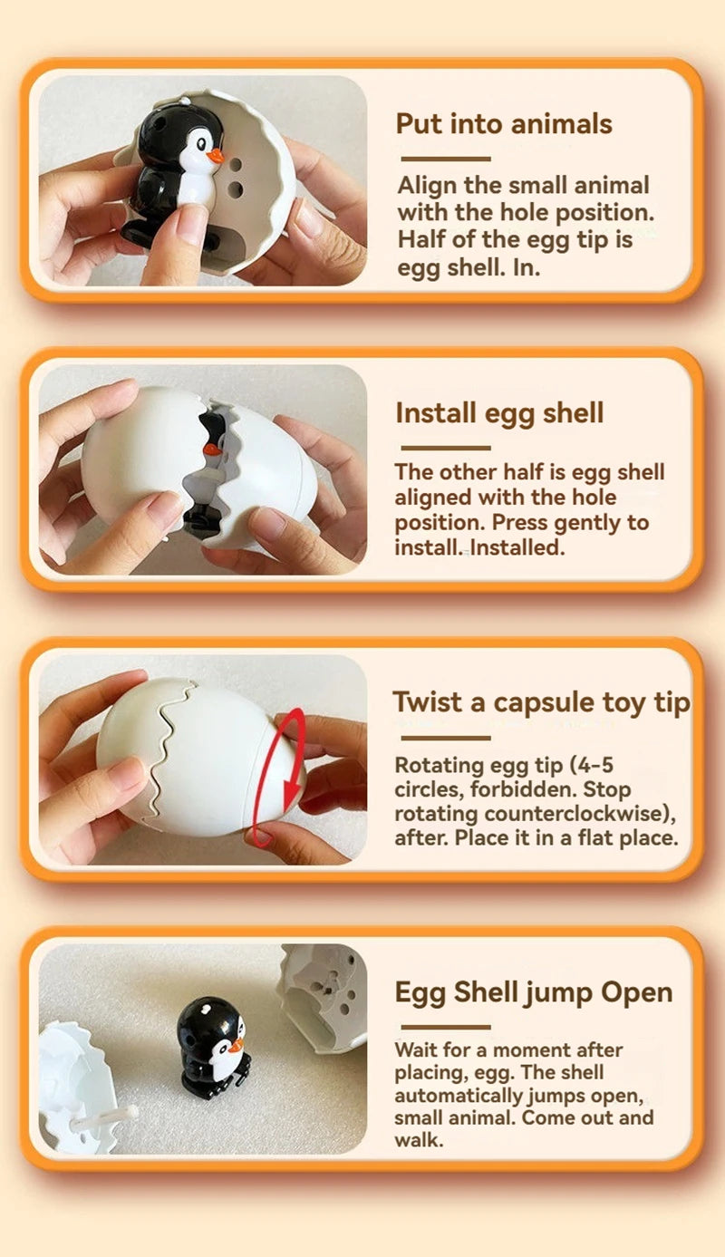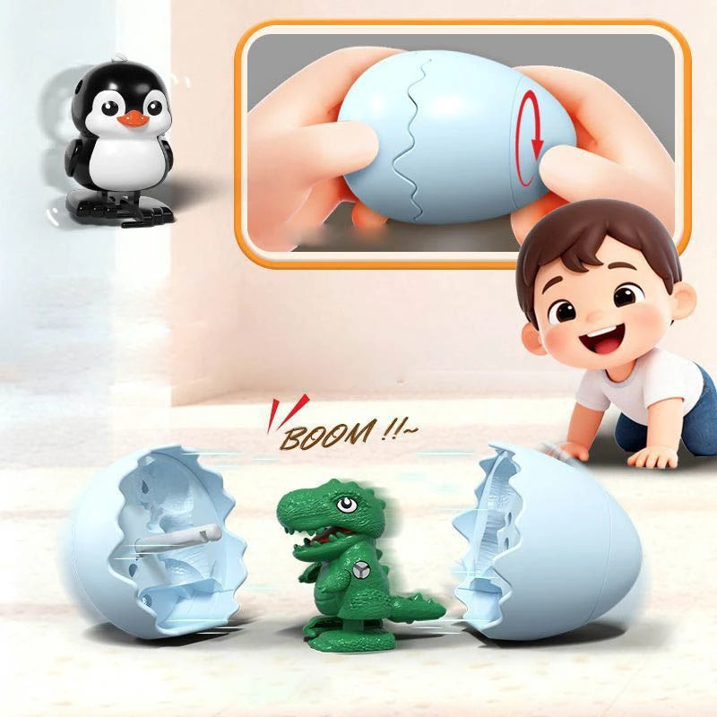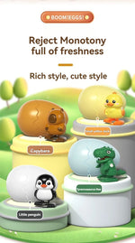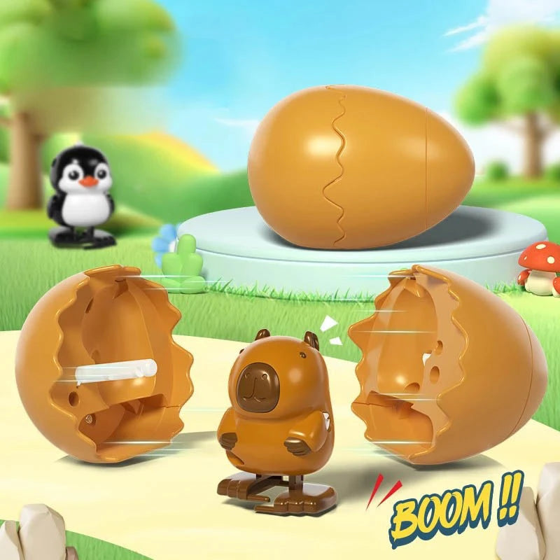 ころんとしたたまごの中から、かわいい動物が“ぽんっ”と飛び出すサプライズトイです。ゼンマイを巻いてたまごを閉じると、転がった衝撃でパカッと開き、元気に跳ね回る動物が登場。シンプルな仕組みなのに何度遊んでも飽きず、驚きと笑顔があふれます。カピバラ・ひよこ・恐竜・ペンギンの4種類から選べる、手のひらサイズのかわいい相棒です。