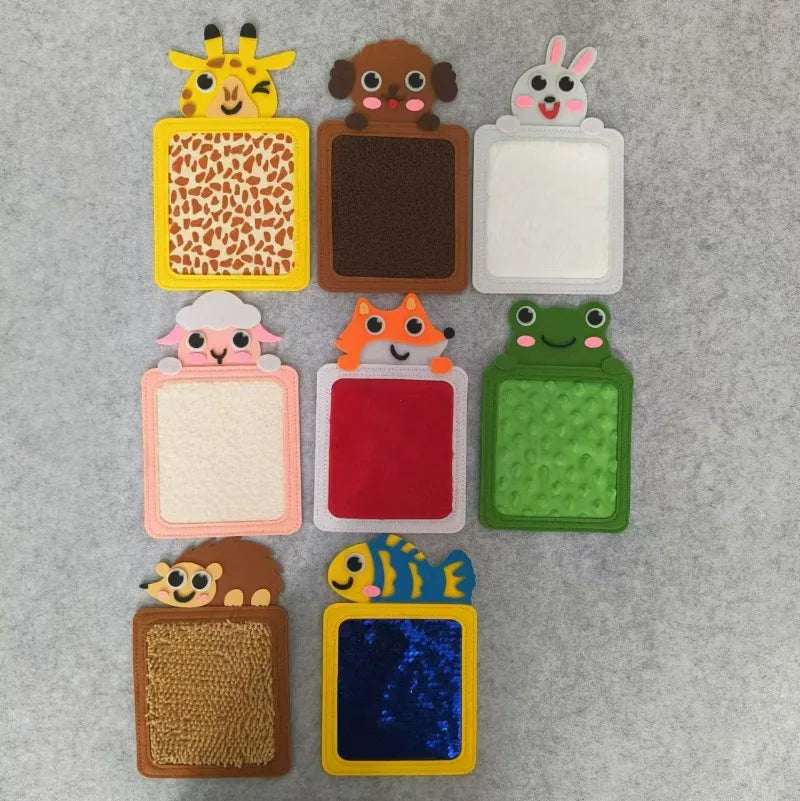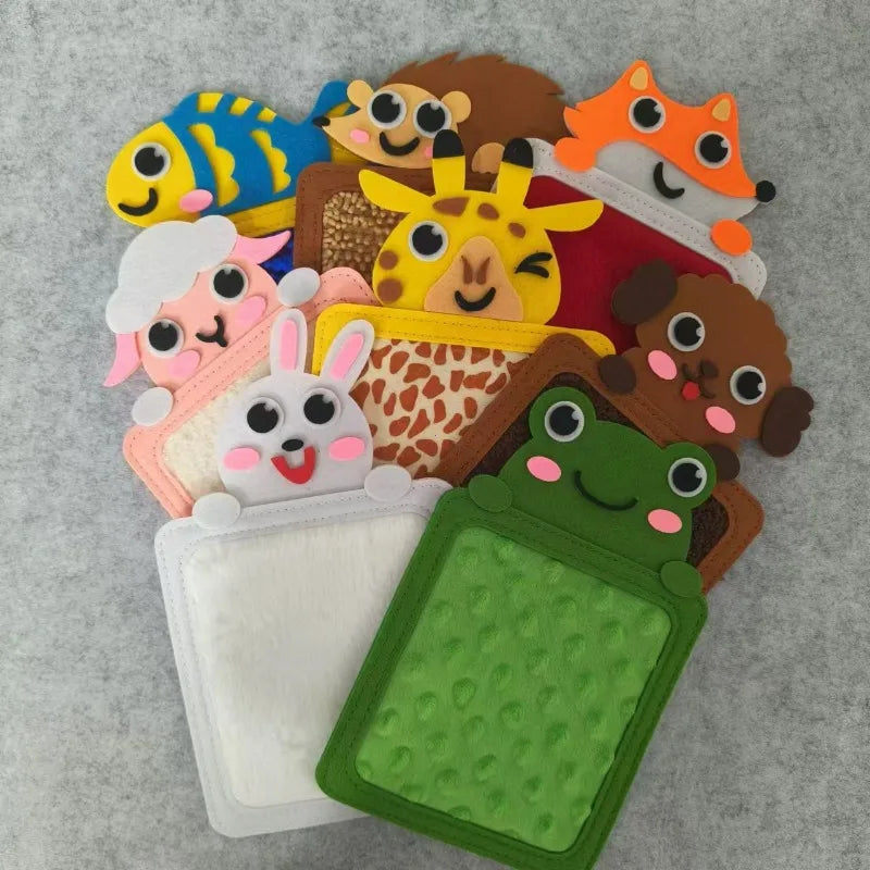 色や手触りの異なるフェルト素材を組み合わせた、動物モチーフの感覚マットセットです。ふわふわ・ザラザラ・凹凸など多様な触感を楽しみながら、触って比べる遊びを通じて子どもの好奇心を引き出します。家庭での知育遊びはもちろん、保育園や幼稚園、療育の現場でも使いやすい設計です。