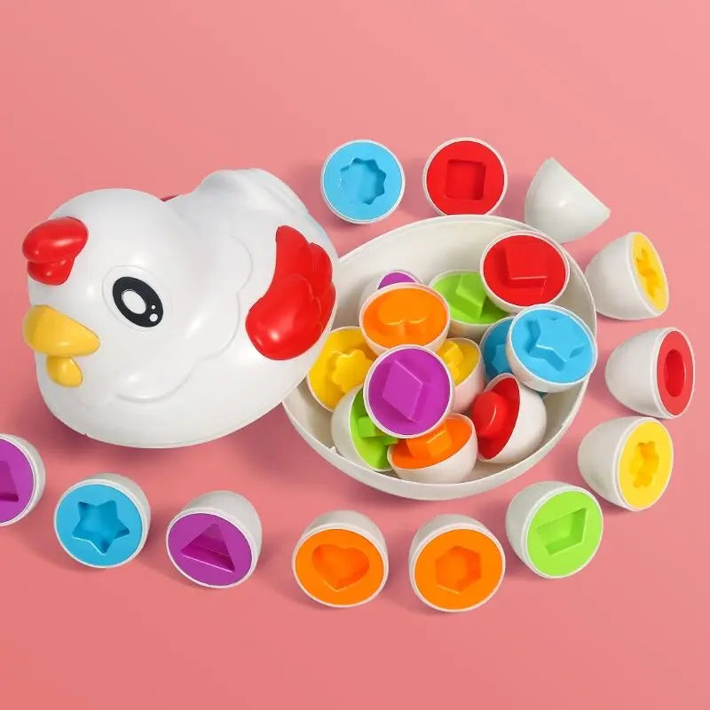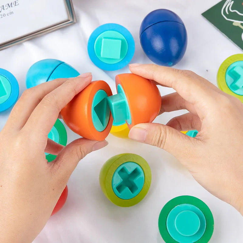 たまごの中にある形を合わせて、正しくはめる遊びができる