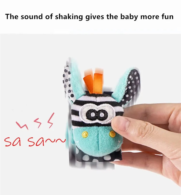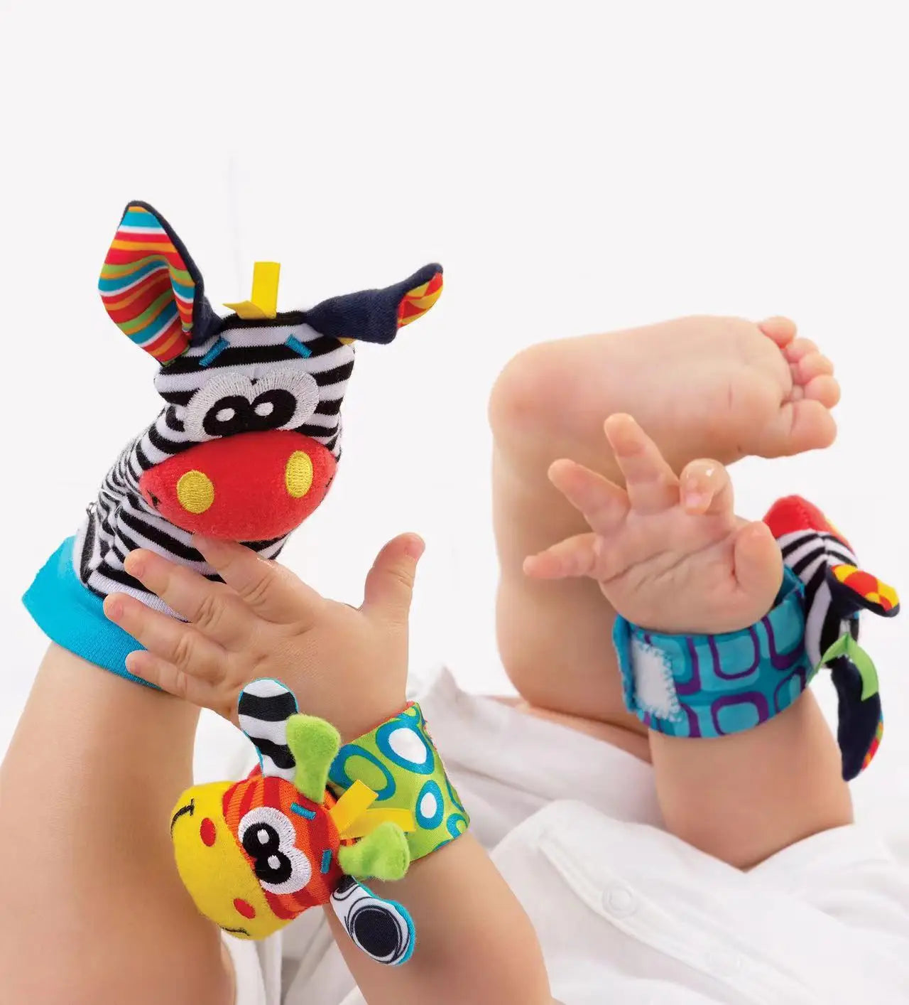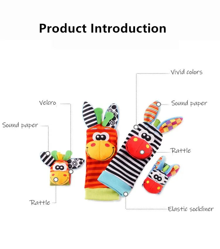 赤ちゃんの手足の動きを楽しく引き出す、ソックス型・リストバンド型のガラガラ知育おもちゃセットです。足首や手首に巻くだけで、動かすたびにやさしい音が鳴り、「蹴る・振る・動かす」体験を自然にサポート。カラフルな動物デザインとやわらかな素材で、視覚・聴覚・触覚をバランスよく刺激します。新生児期から使える軽量設計で、おうち時間はもちろん、お出かけ先でも活躍する実用的なベビートイです。