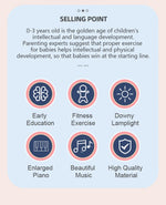 赤ちゃんの「寝る・遊ぶ・学ぶ」をひとつにまとめた多機能ベビープレイマットです。足で蹴ると音が鳴るピアノ、光る鍵盤、手を伸ばして遊べる吊り下げトイを組み合わせ、ねんね期からはいはい期、座って遊ぶ時期まで成長に合わせて使える設計。音や光、色の刺激を通して、毎日の遊び時間を楽しくサポートします。